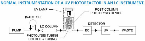 The Biotech KOT reactors can also be used in post-column reaction detection in HPLC (see figure below), using both room temperature and heated chemistries. In this set-up the KOT also ensure thorough mixing between the column effluent and the added reagents. Typical reactions are the production of fluorescent products from reactions between eluted compounds and reagents without native fluorescence.