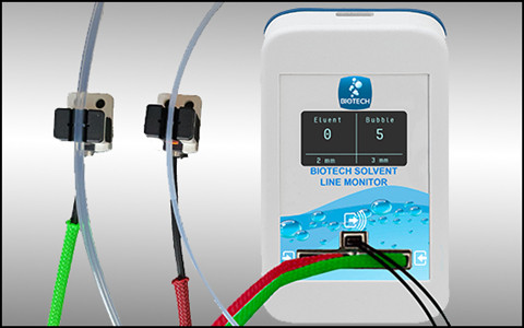 The Biotech Solvent Line Monitor is perfect for any liquid chromatography or fluidic system. It can be set up to automatically trigger a pump shutdown or a switching valve when a solvent flow line becomes empty or contains too many bubbles or micro bubbles. This user-friendly device is powered by USB connection and the intuitive computer program supplied with every unit allows the user to define sensitivity, mode of operation and reaction type. The two optical sensors that can be connected to the Biotech Solvent Line Monitor are clamped on any translucent solvent delivery line with an outer diameter from 1/16 inch to 2 mm, 3mm to 1/8 inch, or 3/16 inch (4.6 mm).