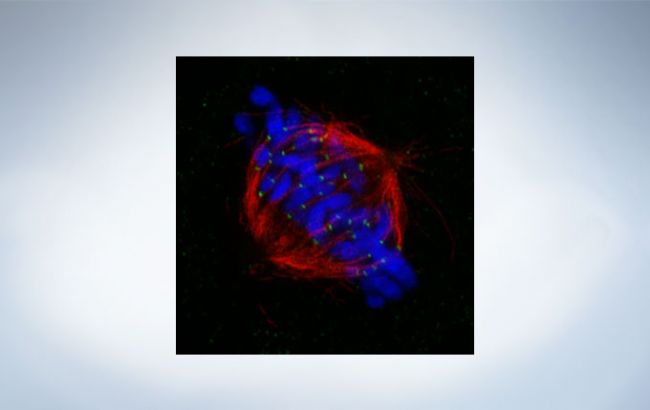 Mitotic spindle at metapahse cell. HeLa cells derived from human cervical cancer were fixed and stained for α-tublin(microtubules,red) and Hec1(kinetochores, green),respectively. DNA was stained with DAPI (chromosomes,blue):