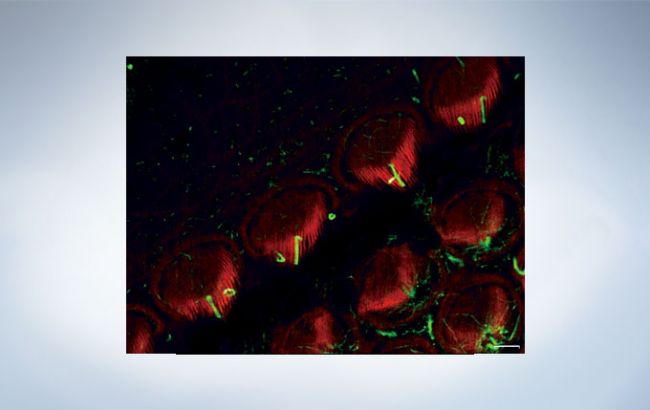 Stereocilia and kinocilia of inner hair cells in the organ of Corti. (Actin:Orange, Tubulin:Green):