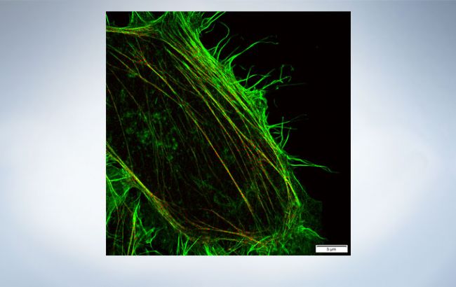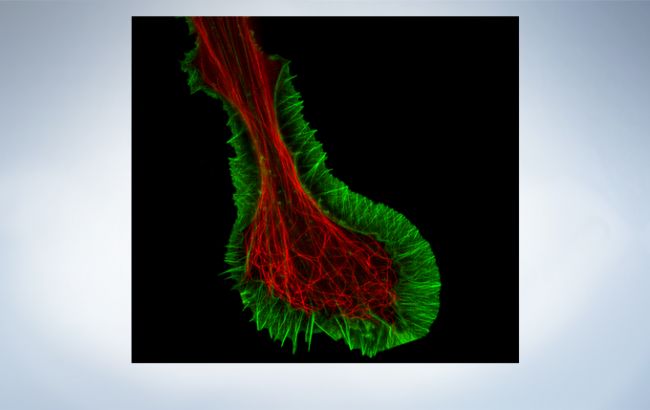 Fluorescent staining of microtubules (red: Alexa Fluor 594) and actin (green: Alexa Fluor 488) in growth cone of NG108 cells: