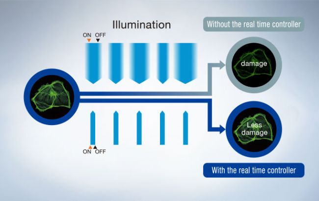 The real time controller (U-RTCE) synchronizes the laser and camera with microsecond illumination accuracy to reduce photobleaching and phototoxicity, helping cells remain healthy during complex experiments.