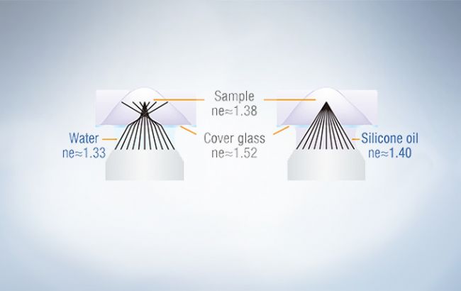 Olympus silicone immersion objectives are designed for deep tissue observation. Observation depth is negatively impacted by spherical aberration caused by refractive index mismatch. The refractive index of silicone oil (ne=1.40) is close to that of living cells or cultured tissue slices (ne=1.38), enabling super resolution imaging of internal cellular structures at tens of micrometers in depth with minimal spherical aberration.