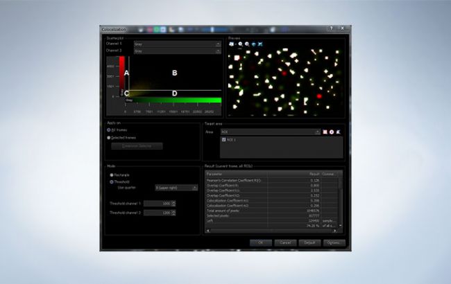 The colocalization function analyzes the fluorescent spectrum and discriminates between overlapping spectra.