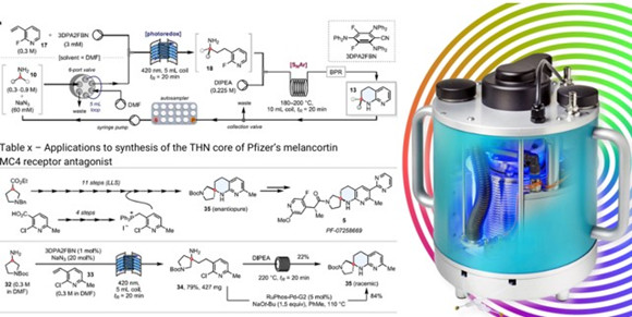 In summary, the researchers have developed an automated, continuous flow synthesis of α-alkylated and spirocyclic 1,2,3,4-tetrahydro-1,8-naphthyridines (“1,8-THNs”), in addition to their regioisomeric 1,6-THN analogues, from abundant primary amine feedstocks. The key step in this work was the photocatalysed HAA reaction step which utilises the unique design of the Uniqsis PhotoSyn photochemical reactor from Asynt, engaging both the high power and low temperatures which were essential for the success of the reaction.