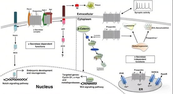 PSEN1 exerts biological effects through two core mechanisms: γ-Secretase-Dependent Function: As part of the γ-secretase complex, it cleaves APP and Notch receptors. PSEN1 mutations increase the Aβ42/Aβ40 ratio, promoting neurotoxic amyloid plaque formation. γ-Secretase-Independent Function: Regulates Wnt/β-catenin signaling, endoplasmic reticulum calcium homeostasis (via SERCA, IP3R, RyanR), and autophagy-lysosome function. It also modulates synaptic plasticity by regulating neurotransmitter release in hippocampal pyramidal neurons—linking to early cognitive impairment in AD.