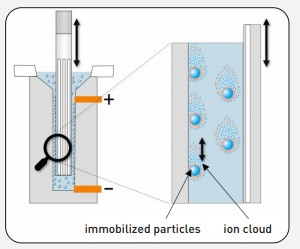 Stabino® II operating principle: streaming potential measurement by immobilising the nano particle and shearing the ion cloud from the diffuse layer to measure zeta potential