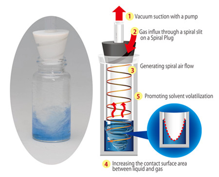 At the heart of each BioChromato Smart Evaporator is a highly efficient spiral airflow created by a special concentrator plug or “Spiral Plug”. This novel Spiral Plug technology generates a helical flow of air or inert gas agitating the surface of the solvent, increasing its surface area and thereby greatly improving the effectiveness and speed of evaporation.