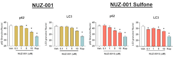 Figure 1: NUZ-001 and NUZ-001 Sulfone decrease p62 and LC3 protein levels in human iPSC-derived neurons. Immunoreactivity of p62 and LC3 was quantified and normalized to total number of nuclei. * p<0.05 vs vehicle (Veh) control using a one-way ANOVA with Dunnett’s post hoc analysis. Rapamycin (Rap) was used as a positive control for autophagy activation