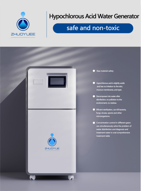 ZYWS Hypochlorous Acid Water Generator is a disinfectant water generator specially developed by our company for waterway disinfection and diagnosis and treatment water of oral comprehensive treatment table, with hypochlorous acid as the main disinfection.