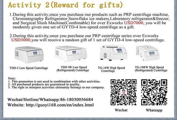 1. During this activity,once you purchase our products such as PRP centrifuge machine,Chromatography Refrigerator,Snowflake ice makers,Laboratory refrigerator&freezer, and Surgical Slush Machine(Combinable) for over Exworks USD7000, you will be randomly given one set of GYTD-4 low-speed centrifuge as a gift.