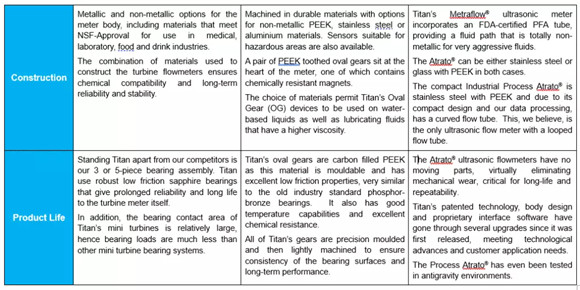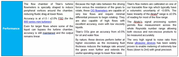 To facilitate a customer’s decision-making process to determine the most suitable flowmeter for their application, the following comparison table highlights the key features of Titan Enterprises’ Turbine, Oval Gear and Ultrasonic flow meters. The more detailed technical specifications of these flow measuring devices can be found on Titan’s website, where a comparison chart of each flowmeter type can also be viewed.