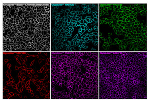 Live HeLa cells labeled with GlycoLiner™ Reactive Biotin detected with CF®488A streptavidin, or GlycoLiner™ Reactive Dyes, imaged by confocal microscopy using a 40X objective.
