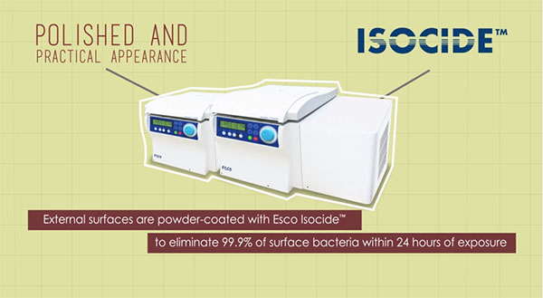 Equipped with maintenance-free, brushless motor, this centrifuge gives you a low noise, smooth operation with superior mechanism design. A wide range of rotors are available for both micro centrifuge and tabletop centrifuge to fit all applications. Moreover, external surfaces are power-coated with Esco ISOCIDETM to eliminate 99.9% surface bacteria within 24 hours of exposure.