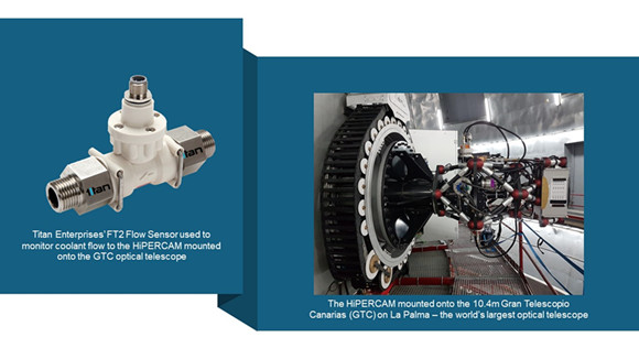 The world’s largest optical telescope, the 10.4m Gran Telescopio Canarias (GTC) on the Canary Island of La Palma, is equipped with a powerful astronomical camera built by the University of Sheffield, UK. The camera, called HiPERCAM, is the most sensitive astronomical camera in the world and has been used to study black holes, neutron stars, white dwarfs, exoplanets, active galactic nuclei and the outer regions of our Solar System. The five light sensors used in HiPERCAM are ultra-sensitive charge-coupled devices which require cooling to 183K (-90°C) to minimise noise in the images. This cooling is achieved using very high performance thermo-electric (peltier) coolers, which in turn require a liquid coolant (a water-glycol mixture at +5°C) to remove the heat they extract. Micro bubbles and metallic sludge in the telescope’s coolant supply meant that a flow measurement device impervious to these unavoidable characteristics was essential. Titan’s FT2 optical flow sensor that uses an LED and photo-diode to measure flow was used successfully without being affected by the undesirable properties of the telescope’s cooling fluid.